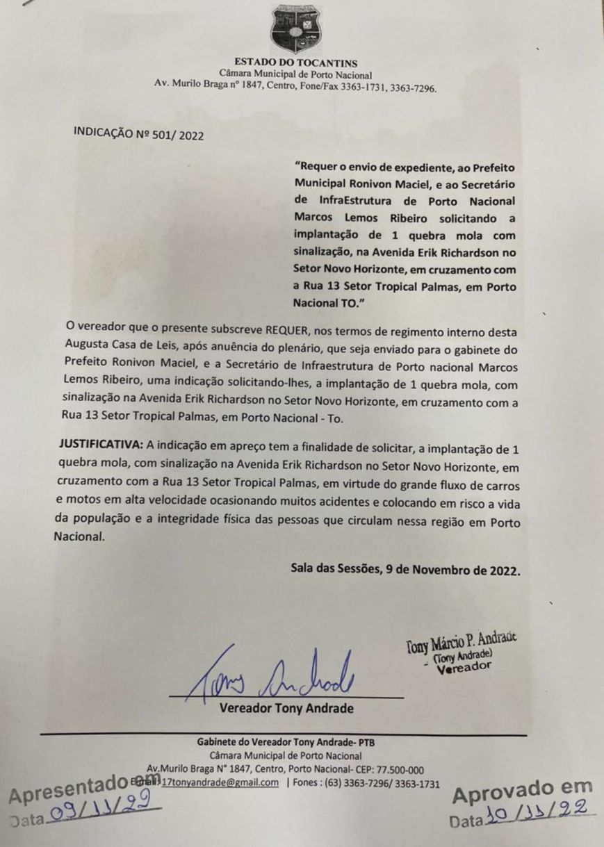 Indicações e Requerimento do Vereador Tony Andrade