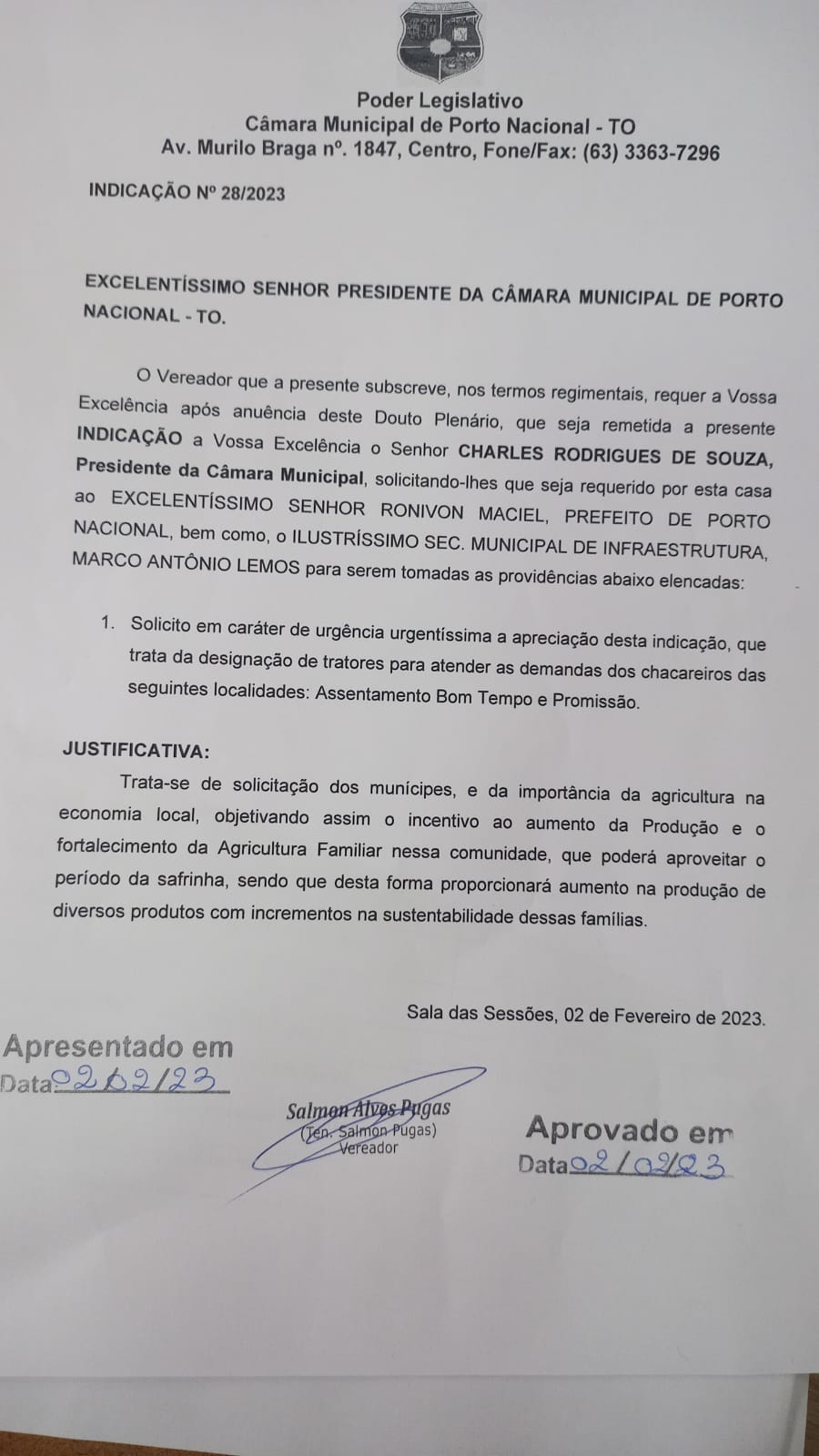 Indicação nº 020/2023 - Vereador Ten. Salmon Pugas